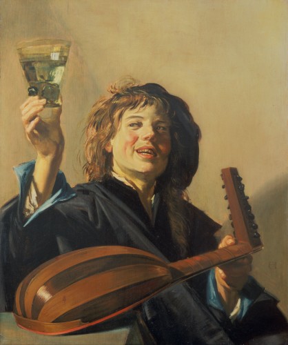 pose, drink in hand singing;