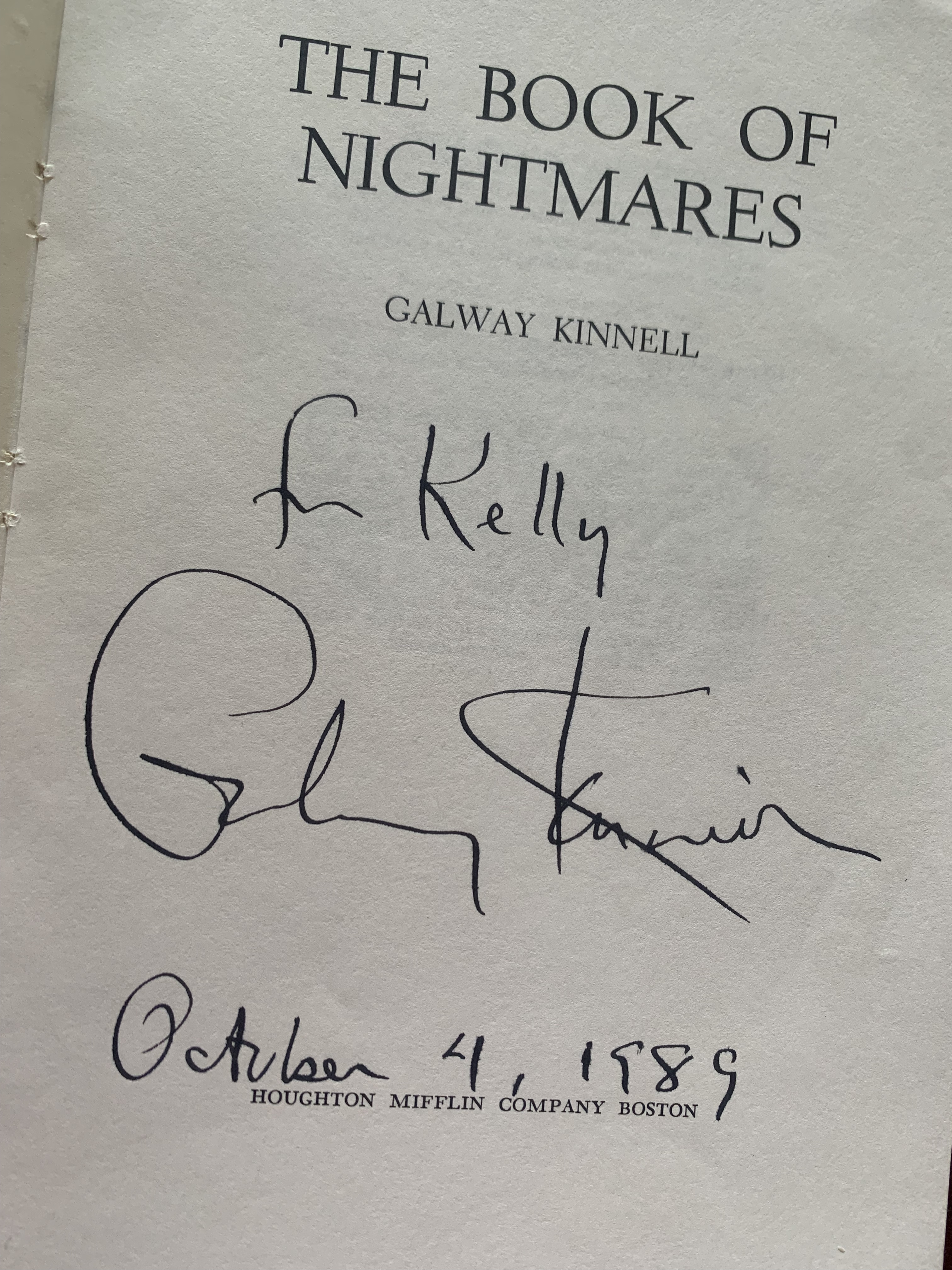 After years of reading and re-reading “Nightmares,” as well as his other books, Kinnell came to Texas State to do a reading in 1989. Lisa, Donna and I drove down to see him. After the reading there was a reception where the attendees could talk with Kinnell. I was too introverted to attempt a meeting, even though I had brought my old copy of Book of Nightmares for him to sign, if by some miracle I was able to summon enough gall to speak to the poet. Donna and Lisa went off to find the restroom and left me sitting on a bench awaiting their return. While I waited a man came over and sat down on the bench next to me. It was Galway Kinnell. I figured I had to talk to him, since there he was. We made forgettable small talk about Vermont, and he graciously signed my copy of Nightmares.