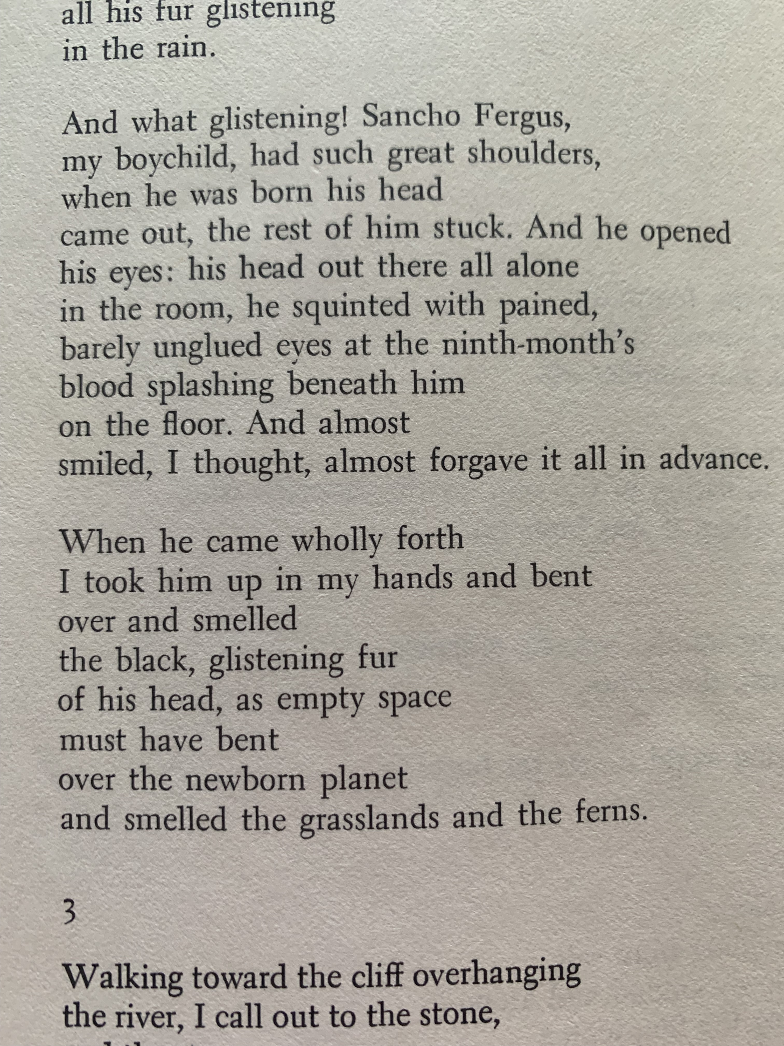 Last night after I pulled it off the shelf again, after years of not thinking about it, I read it again from start to finish. It is still an amazing poetic achievement. Reading it, I immediately fell into the slow rhythms, and stunning imagery. Themes of universal birth and death, creation and time mixed in with the personal reflections on the birth of his own children are just a part of the overall power of the book. I was lucky to have run across it that day in the Coop basement, it has been a true companion in my literate life.